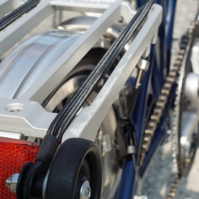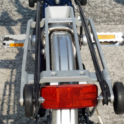 荷物を載せることができる便利なリアキャリアを装備しています。折り畳んだ状態で転がして運ぶことも可能です。