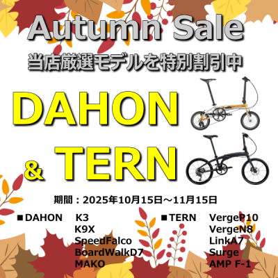 当店が厳選したDAHONとTERNの人気モデルが、期間中(2025年10月15日~11月15日)は特別割引価格となっています。これからの季節は自転車にとって最高のシーズンになりますので、新しくデビューしたい方や新車に乗り換えたい方は、是非ご検討ください!ご注文は店頭でもネットからでもお電話でも受付致します。皆様のご注文をお待ち致しております!